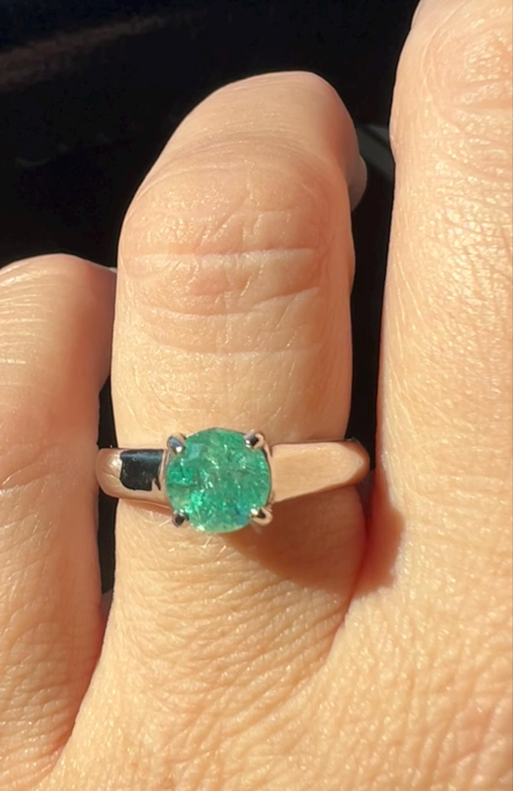 The 1.17 carat, Natural Colombian Emerald has vivid saturation, and excellent SI clarity with only very slight internal visible inclusions, and is a glowing neon-green color! Photos are taken under professional lighting and are magnified at 50x zoom to show details that may not be visible to the naked eye. The ring is clearly hallmarked 14K on the inside of the 2.50mm band. When worn, the top of the ring/stone is elevated about 7.00mm from the finger.