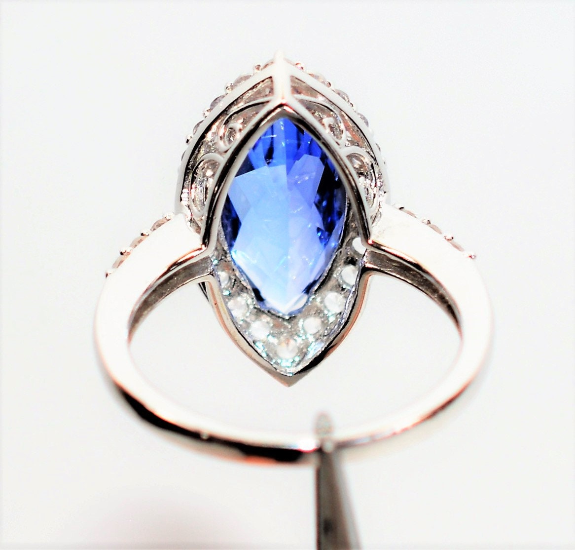 The 4.79 carat, Natural Tanzanites has vivid saturation, and excellent VS clarity with no visible inclusions, and is a dazzling violet-purple-blue color! Photos are taken under professional lighting and are magnified at 50x zoom to show details that may not be visible to the naked eye. Accenting the rare gemstones are 2.00mm round cut, natural Diamond accents (28 total) that are H color with VS2-SI1 clarity and weighs a combined total of 0.84 carats. The ring is clearly hallmarked 10K on the inside of the 2.25mm band. When worn, the top of the ring/stone is elevated about 6.5mm from the finger.