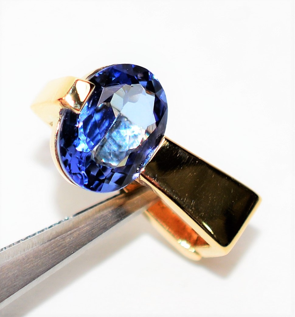 The 1.36 carat, GIL Certified, Natural Tanzanite has vivid saturation and excellent clarity with no visible inclusions, and is a glowing violet-purple-blue color! Photos are taken under professional lighting and are magnified at 50x zoom to show details that may not be visible to the naked eye. The pendant is clearly hallmarked 14K on the inside of the loop, and is hung on a .90mm thick, 14K solid gold (not hollow),18” box-chain necklace that is also clearly hallmarked 14K on the sturdy lobster claw clasp closure. When worn, the pendant drop is 16mm from the chain.